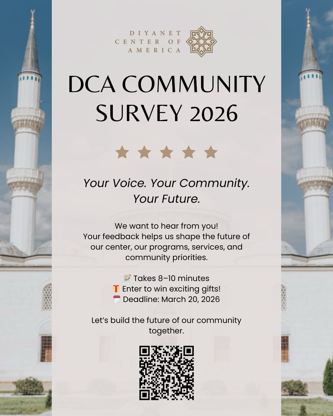The Diyanet Center of America (DCA) is more than just a mosque; it is a place of worship, learning, and community support. Your generous donations allow us to maintain and expand our facilities, ensuring they continue to serve as a spiritual and cultural hub for everyone. By contributing, you help preserve the beauty of our mosque and the surrounding 17-acre grounds while supporting the vital programs and services we offer to our local and global community.